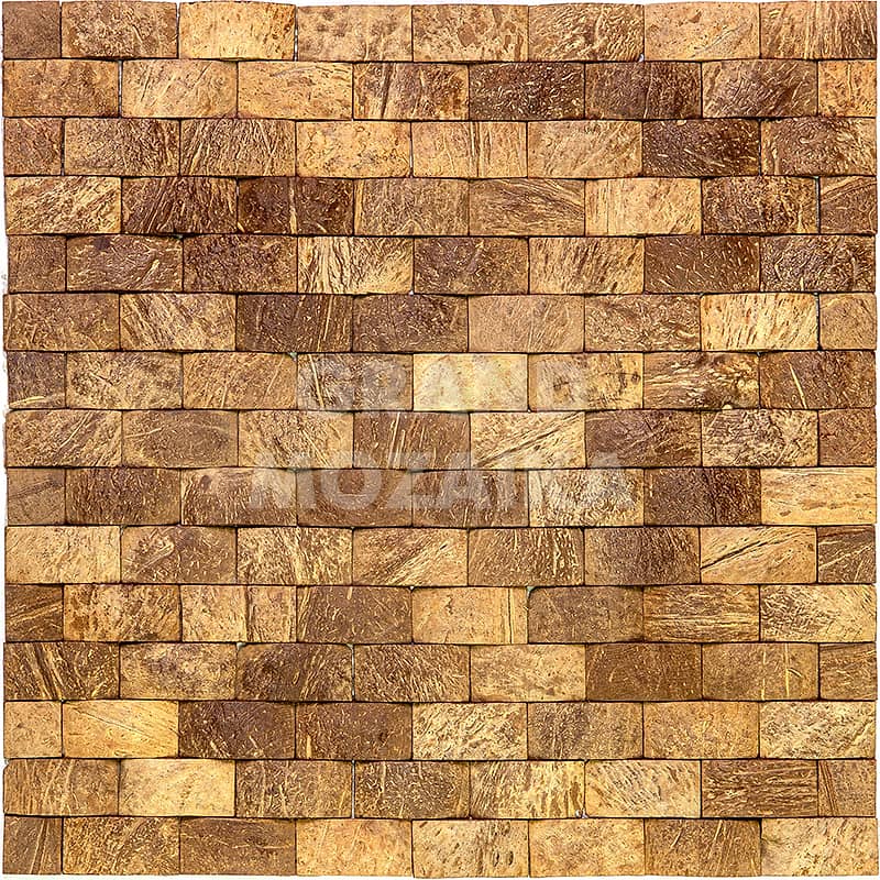 Мозаика Exotica серии Coco Mosaic выполнена из скорлупы кокосового ореха. Кокосовая скорлупа, очень прочный материал, поэтому мозаика из него может выдержать механические воздействия и удары. Кокос произрастает в жарких влажных странах, поэтому он устойчив к влаге и воздействию температур. Такую мозаику можно использовать для облицовки жилых помещений, это экологически чистый материал. Представленное полотно размером 300х300 выполнено из небольших кусочков нескольких размеров, выложенных в виде кирпичной кладки.
