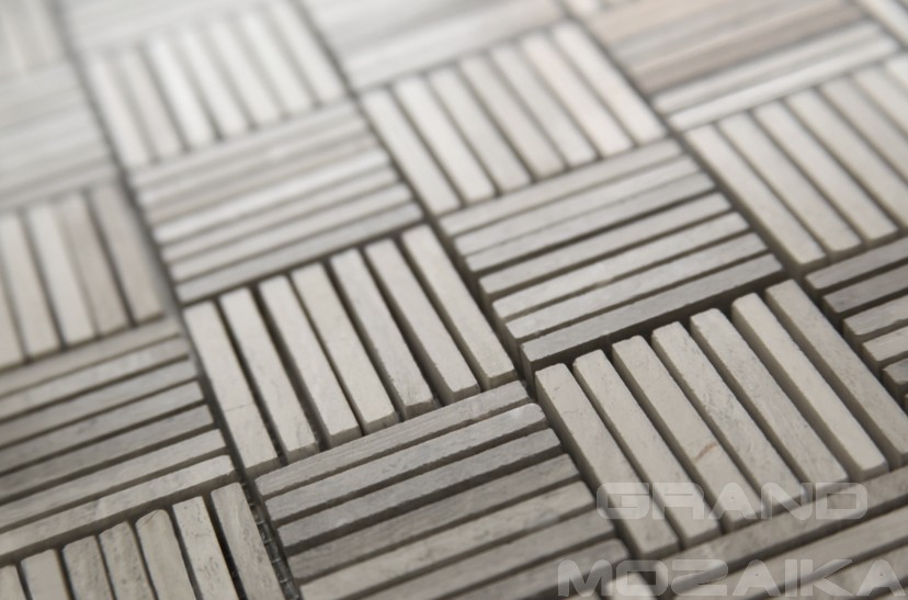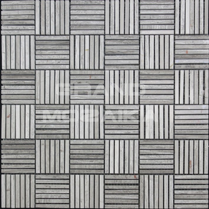 Мозаика из натурального камня серии S-Line выложена из серого полированного мрамора произвольной формы. Кусочки различной формы создают строгий геометрический рисунок. Такая мозаика украсит любой интерьер.
