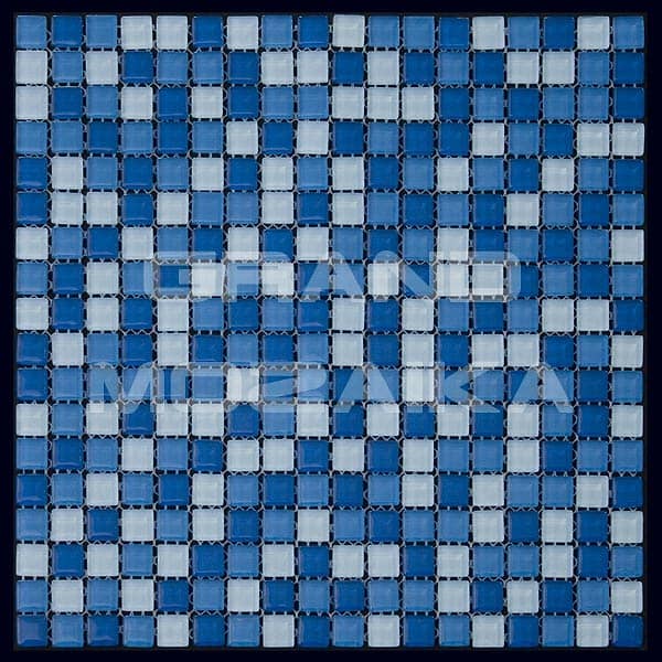 Стеклянная мозаика голубого цвета серии Mix. Состоит из мелких (15х15 мм) кусочков бело-голубого, небесного голубого и светло-синего цвета. Идеально подходит для отделки ванных комнат и других помещений. Поверхность глянцевая, размер сетки 295х295 мм. Толщина мозаики - 4 мм.