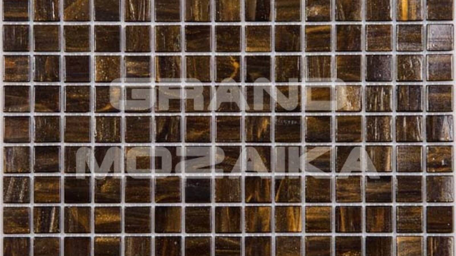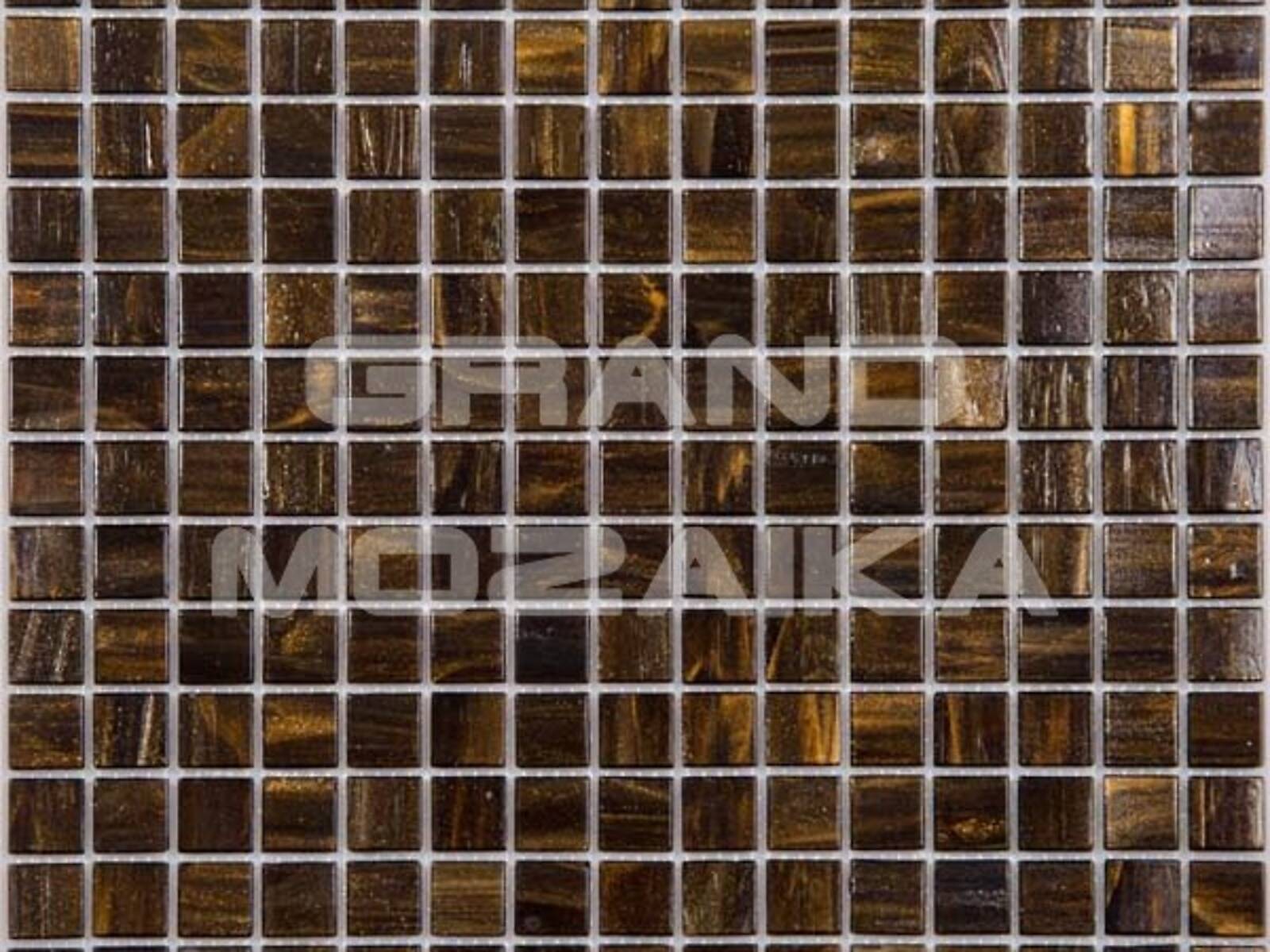 Стеклянная мозаика серии Golden состоит из модулей коричневого цвета с золотыми разводами. Полотно крепится к сетке размером 327*327 мм. Модули размером 20*20*4мм. Поверхность блестящая, глянцевая. Мозаика отлично переносит значительную температуру, поэтому ею можно облицовывать и украшать камины.