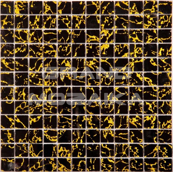 Мозаика серии Exclusive черного цвета с золотыми узорами-разводами сделает помещение по-настоящему роскошным. Стеклянные плитки 23х23х4 мм. Полотно тыльной стороной крепится к сетке размером 300х300 мм. Такая мозаика эффектно смотрится не только на горизонтальных поверхностях кухни и ванной комнаты, но и в качестве декора отдельных элементов интерьера, например, рамки для зеркала.