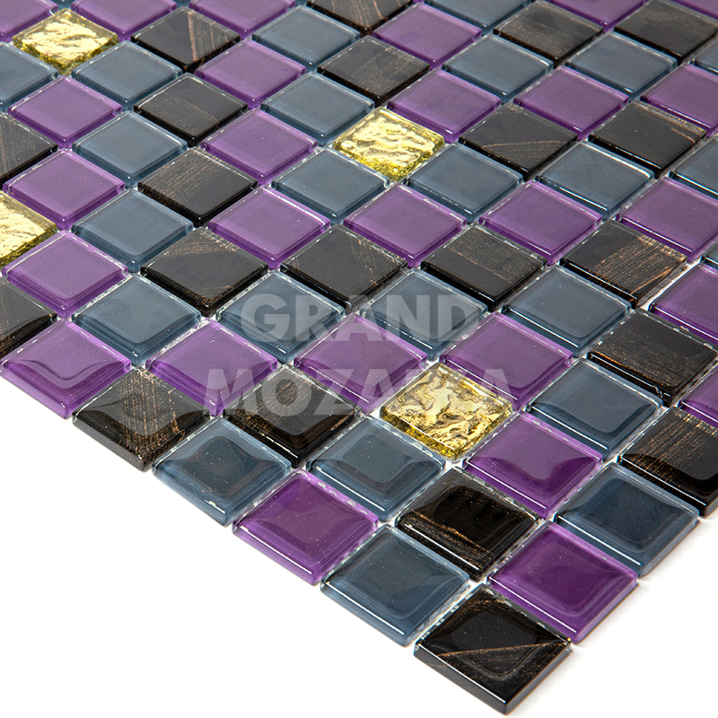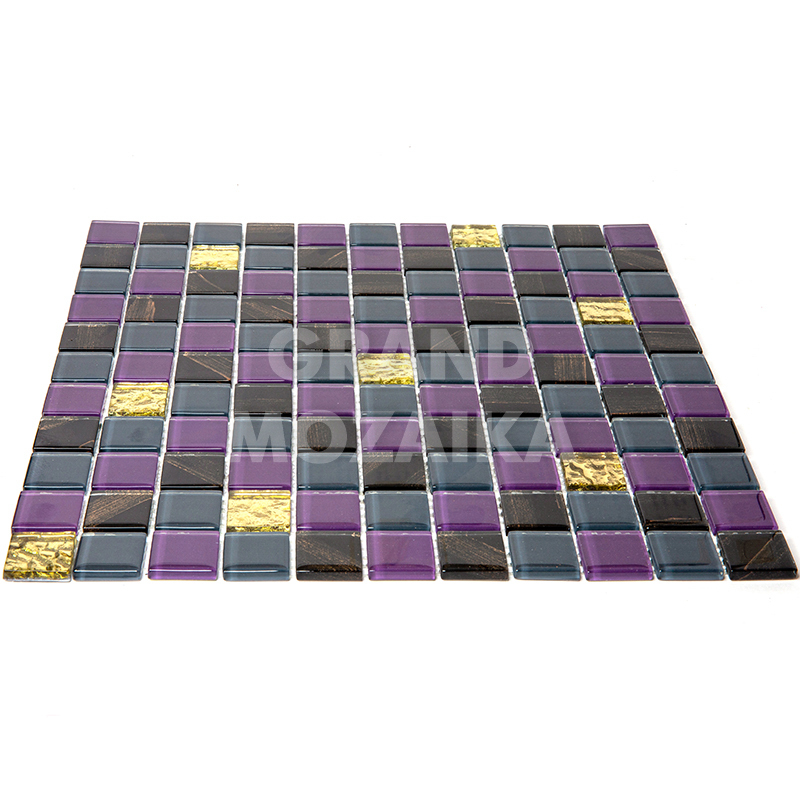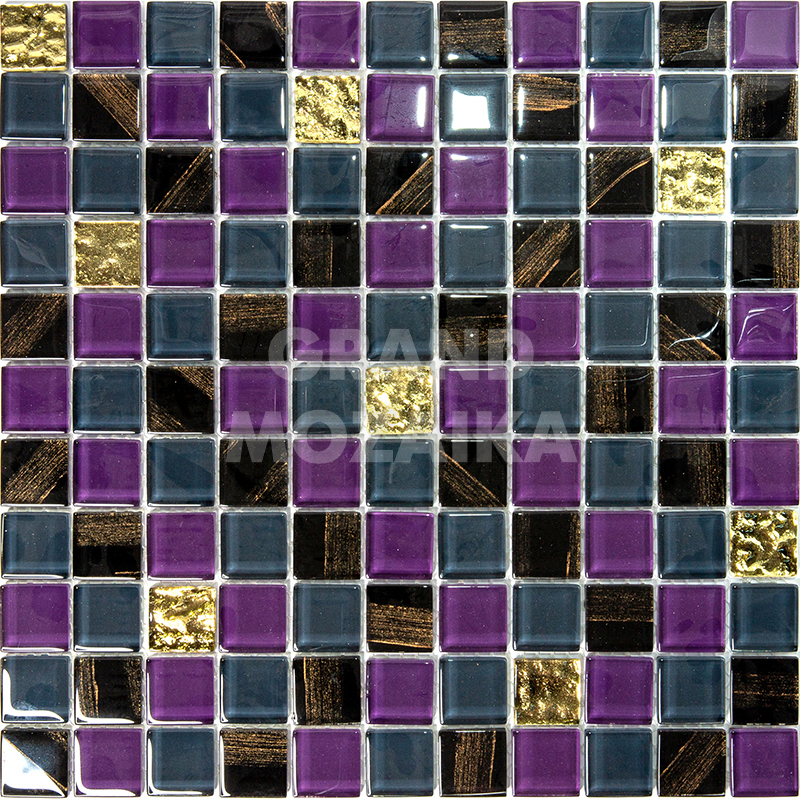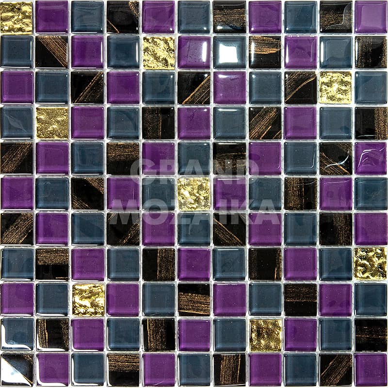 Стеклянная мозаика серии Flash. Состоит из мелких (25х25 мм) кусочков фиолетового, черного и бежевого цвета. Добавление элементов с оригинальным рисунком придают полотну объем. Идеально подходит для отделки ванных комнат и других помещений. Поверхность глянцевая, размер сетки 295х295 мм. Толщина мозаики - 5 мм.