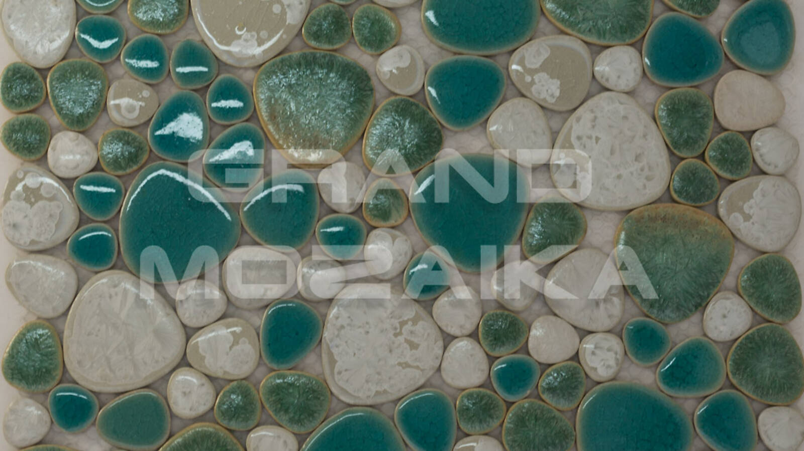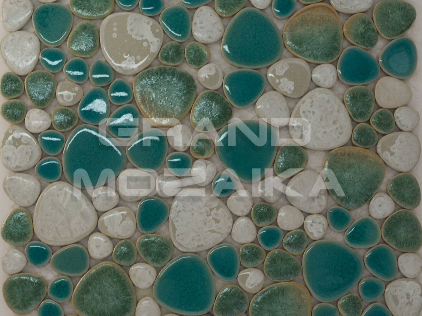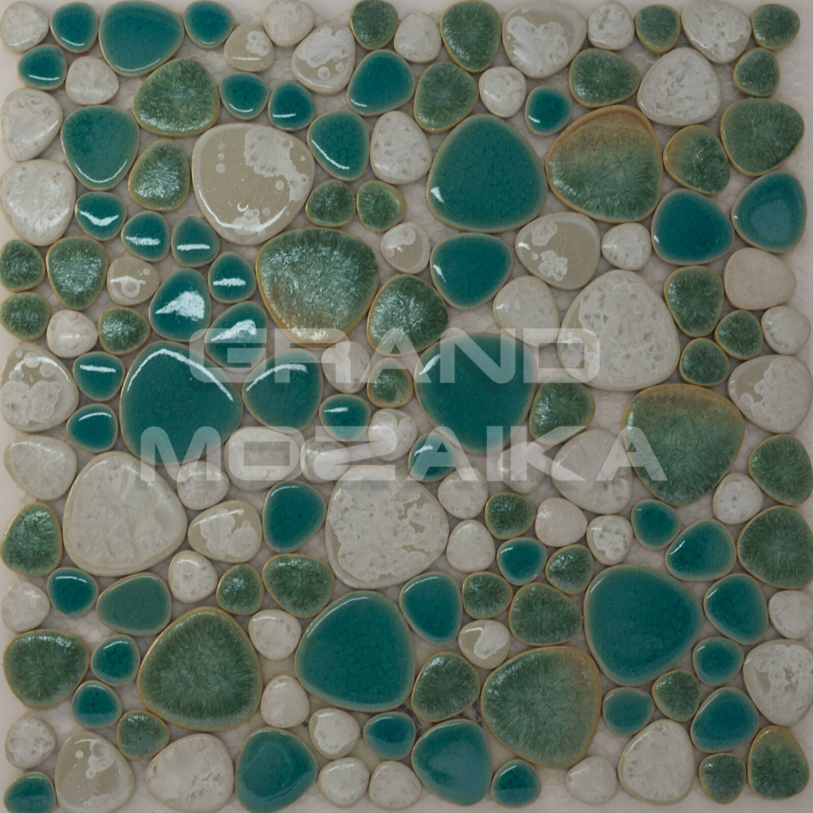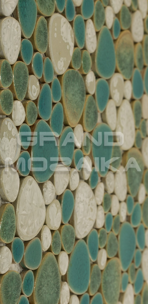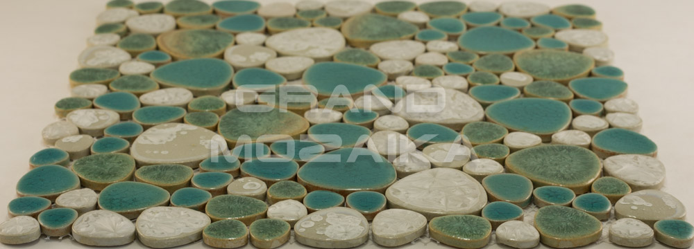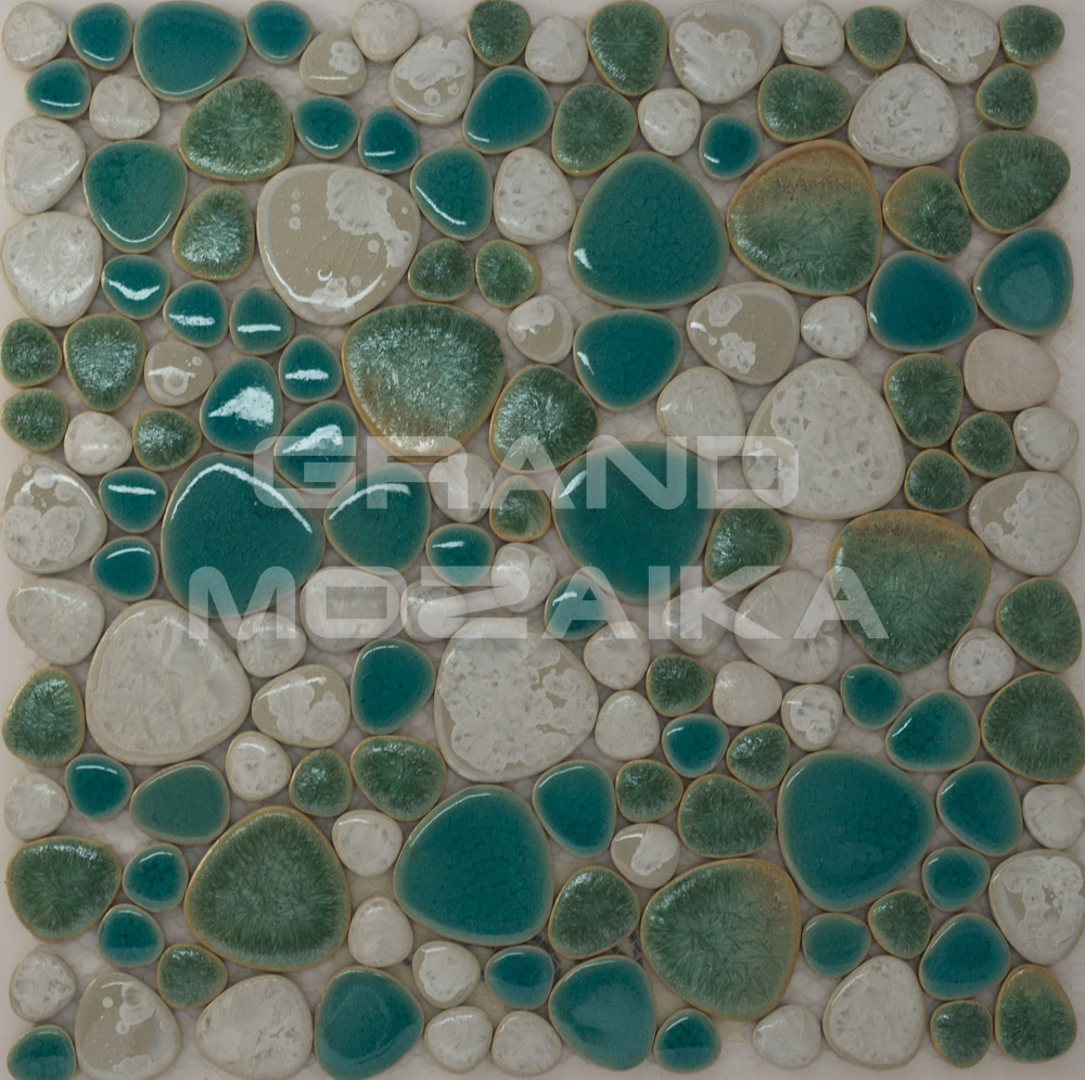 Керамическая мозаика серии Pebble collection округлой формы, имитирующая плоскую морскую гальку. Бирюзово-зеленоватые оттенки создадут в помещении неповторимую атмосферу морского побережья. Размер листа 305х305 мм. Толщина мозаики 4 мм. Отлично подходит для облицовки скруглённых поверхностей бассейнов, а также настенной и напольной отделки ванных и туалетных комнат.