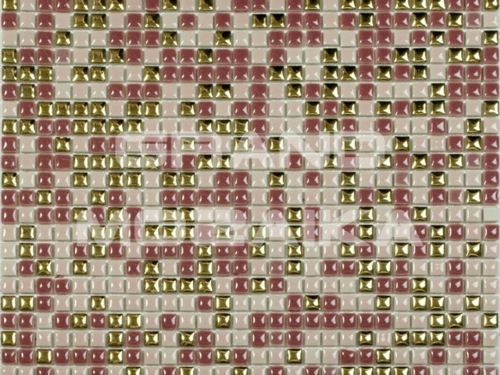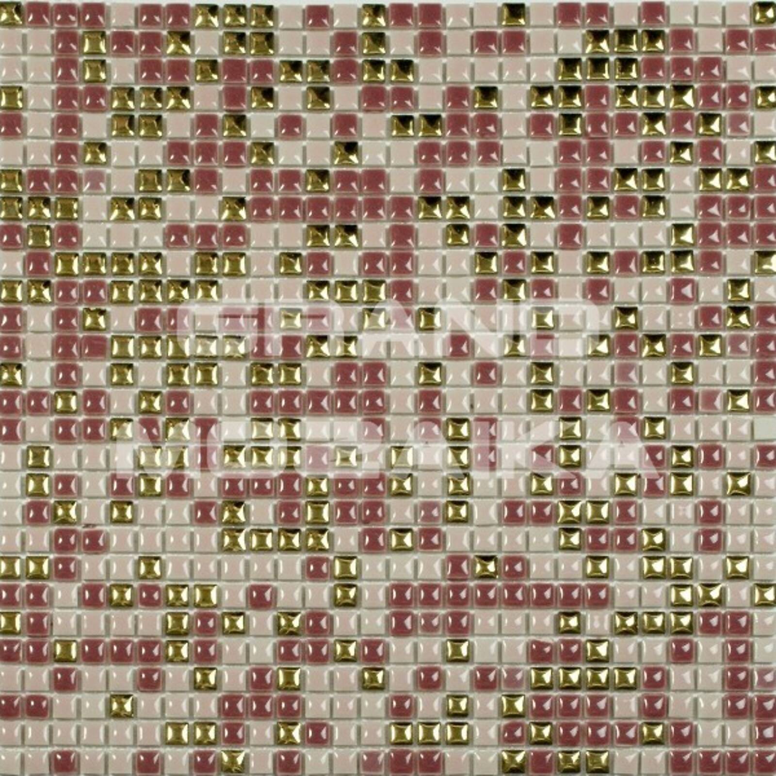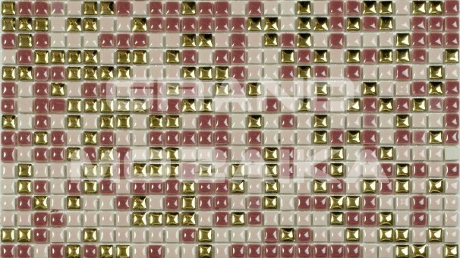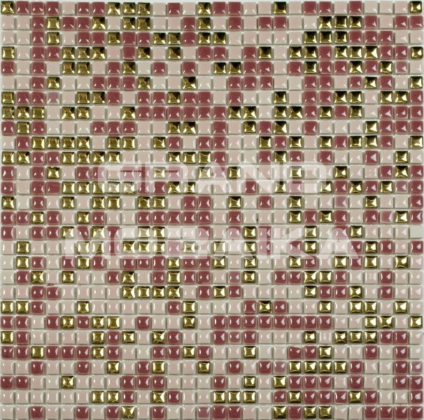Представляемая мозаика серии Exclusive состоит из керамических плиточек размером 10*10 мм, больше напоминающих капли. Золотые чипы разбавляют общую розовую гамму полотна и придают ему особую роскошь. Толщина мозаики 6 мм. Керамическая мозаика вообще не горит и к тому же защищает облицованную ею поверхность, а при нагревании не выделяет никаких вредных веществ.