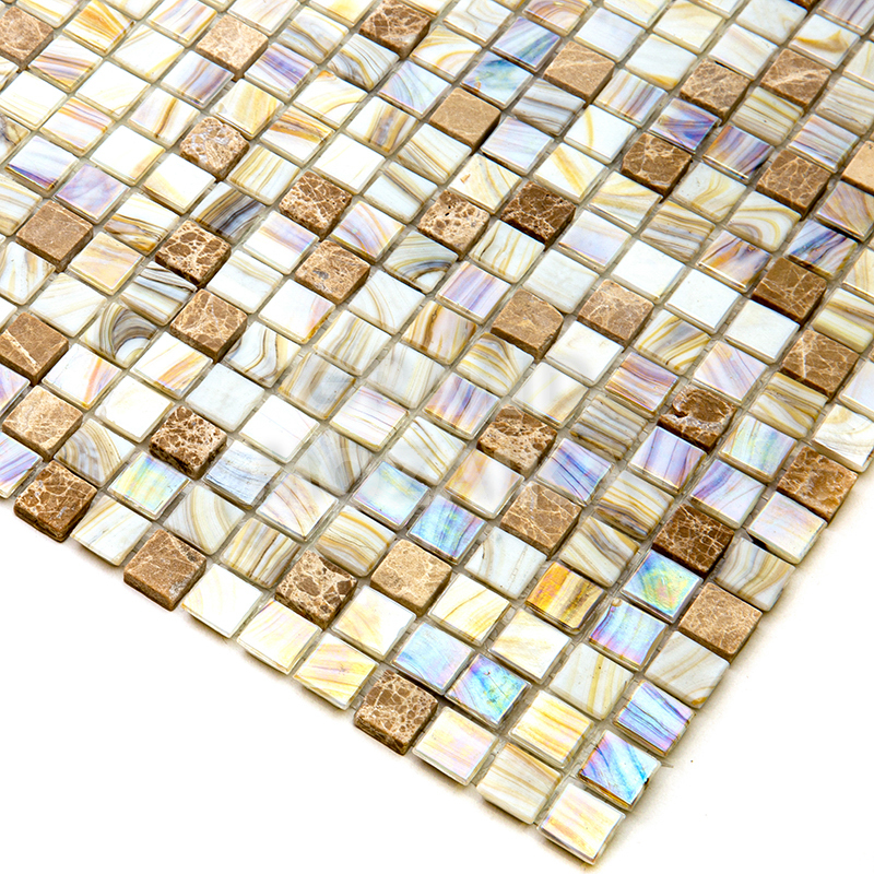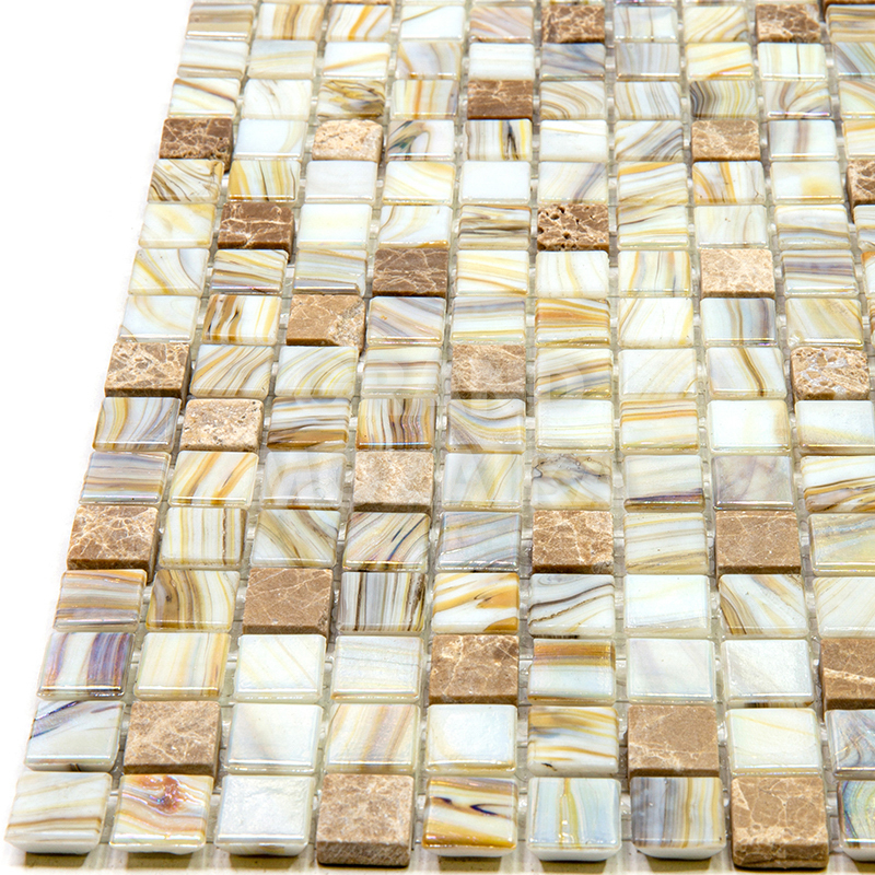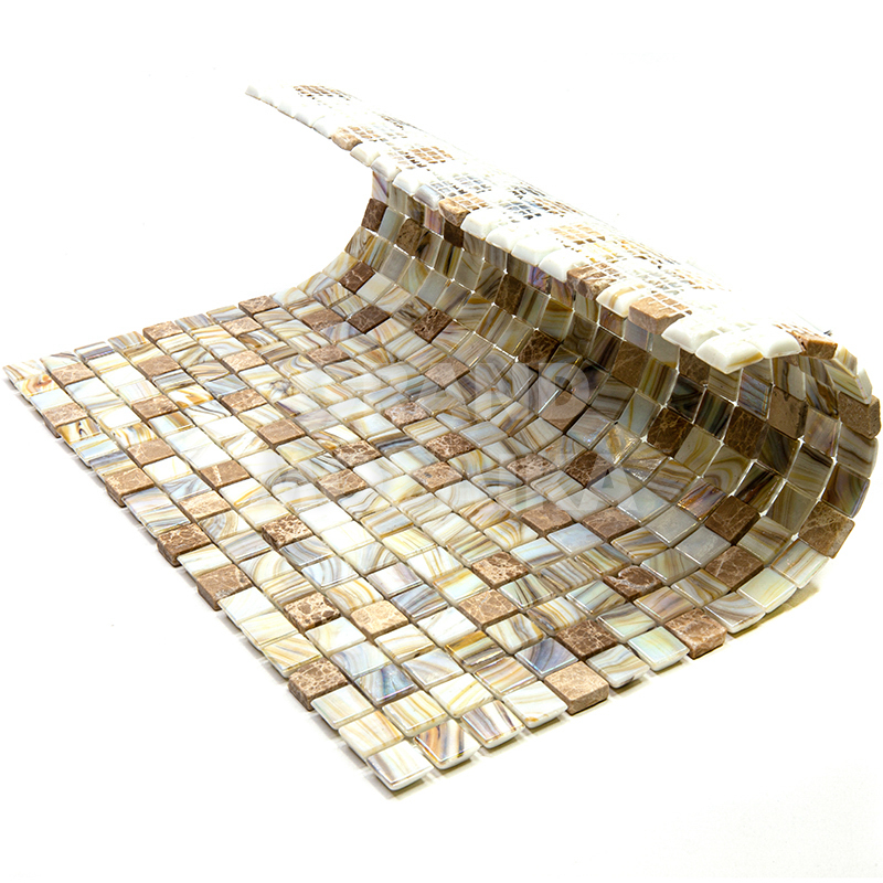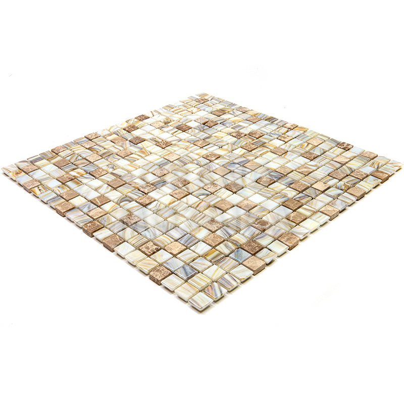 Мозаик серии Amber выполнена из маленьких кусочков стекла и камня размером 15х15 мм. Элементы серебряного цвета сделаны из стекла с размытым рисунком. Полотно 327х327 удобно в монтаже и не требует особых навыков.