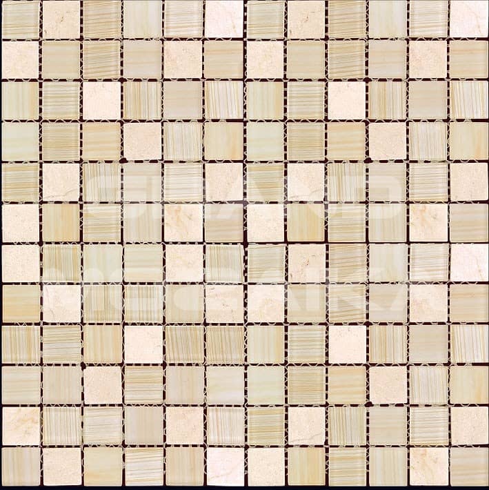 Микс мозаика серии Mix Glass&Stone состоит из кусочков размером 23х23 мм. Полотно размером 300х300 мм состоит из стеклянных и каменных мозаик различных оттенков бежевого цвета. Такая мозаика послужит оригинальным дополнение любого интерьера.