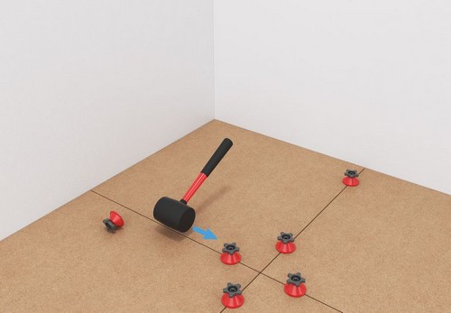 2. Укладка каждого последующего ряда плитки производится таким же способом. В зависимости от размеров плитки и выбранного рисунка при укладке установите одну или несколько стоек-оснований на каждую сторону.
